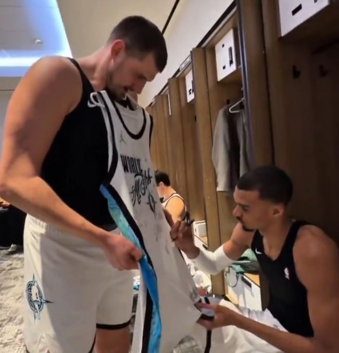 約基奇全明星周末唯一的亮點可能就是找文班亞馬簽名了,他讓文班亞馬在簽名后畫一個外星人的頭像。約基奇全明星劃水也引發(fā)了巨大的議論。