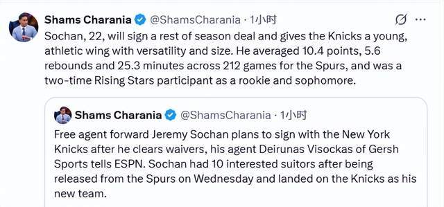 索漢已于周五經(jīng)與馬刺雙方協(xié)商后被球隊(duì)裁掉。Shams表示,在澄清期結(jié)束后,共有10支球隊(duì)對(duì)他有意。他本賽季薪資為710萬美元且即將到期,因此幾乎不可能被其他球隊(duì)認(rèn)領(lǐng)。